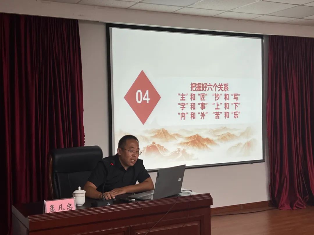 孟主任结合多年文稿写作经验和生动具体的写作案例,从把握好“三字”文风,把握好立意、结构、内容、语言四大要素,把握好搜集资料、拟定提纲等五个环节,把握好“主”和“匠”的关系、“写”和“抄”的关系等六个关系等四方面全方位进行了讲解。